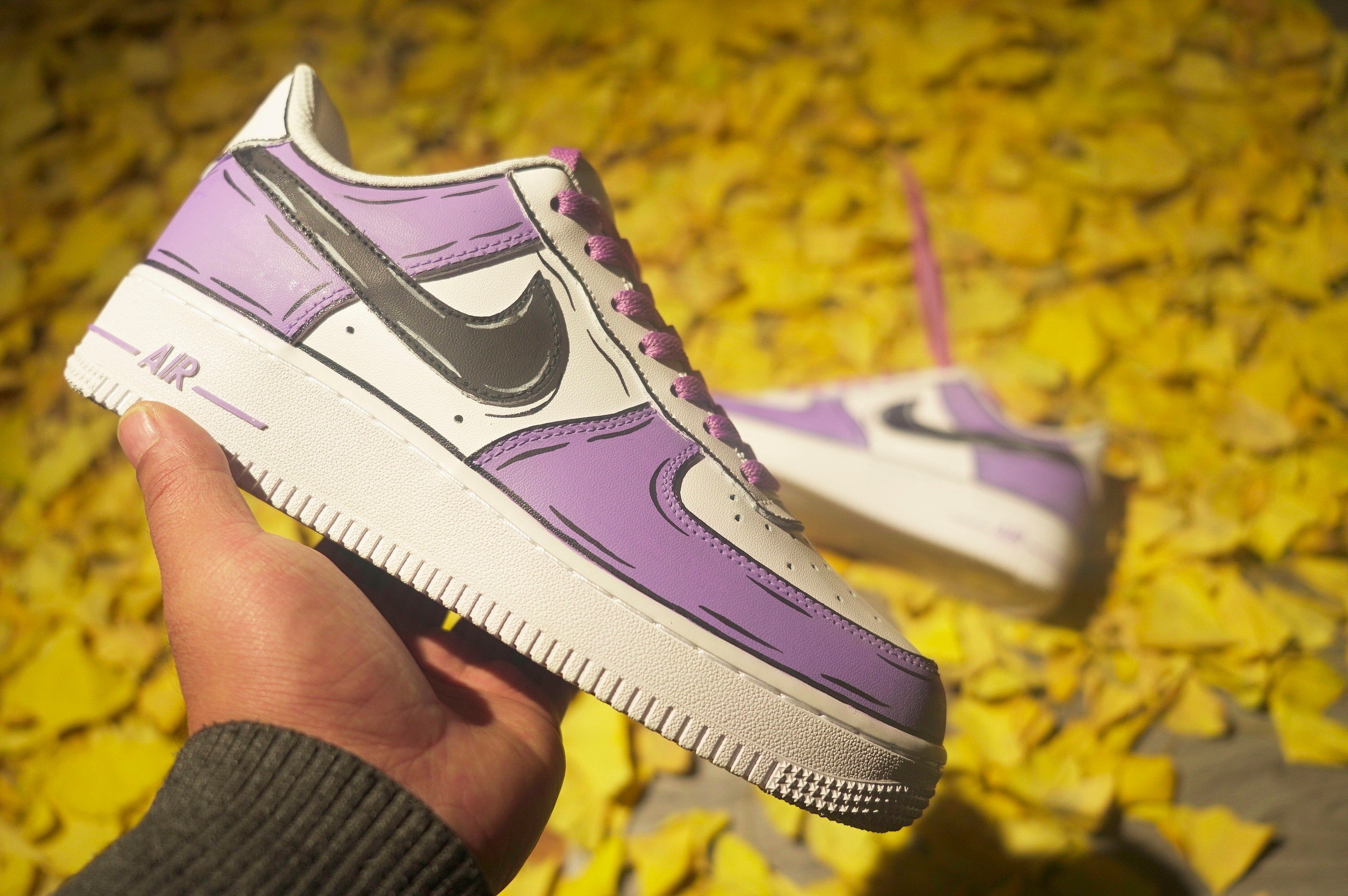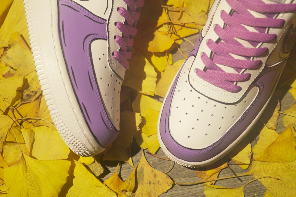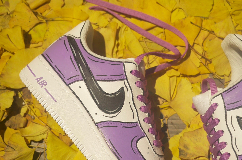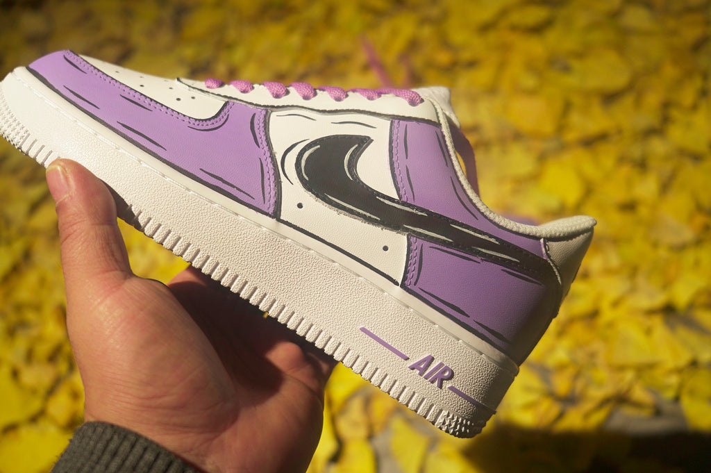 Stand out from the crowd with our Purple and Black Custom Air Force 1 shoes. Designed for risk-takers, these bold kicks will take you on a wild ride of style and adventure. Don't be afraid to make a statement with our unique design and fearless attitude. Step into a world of excitement with these custom shoes.