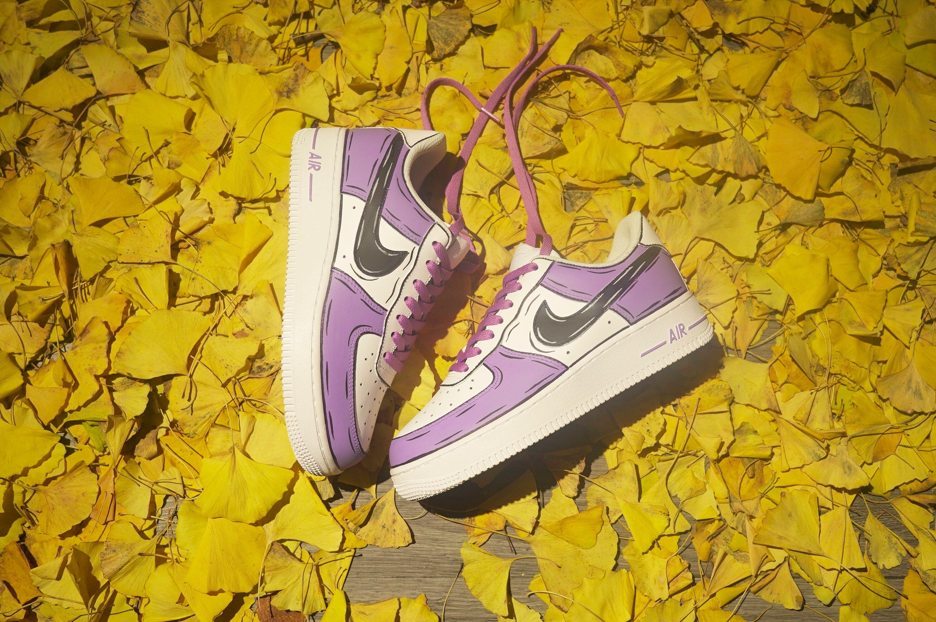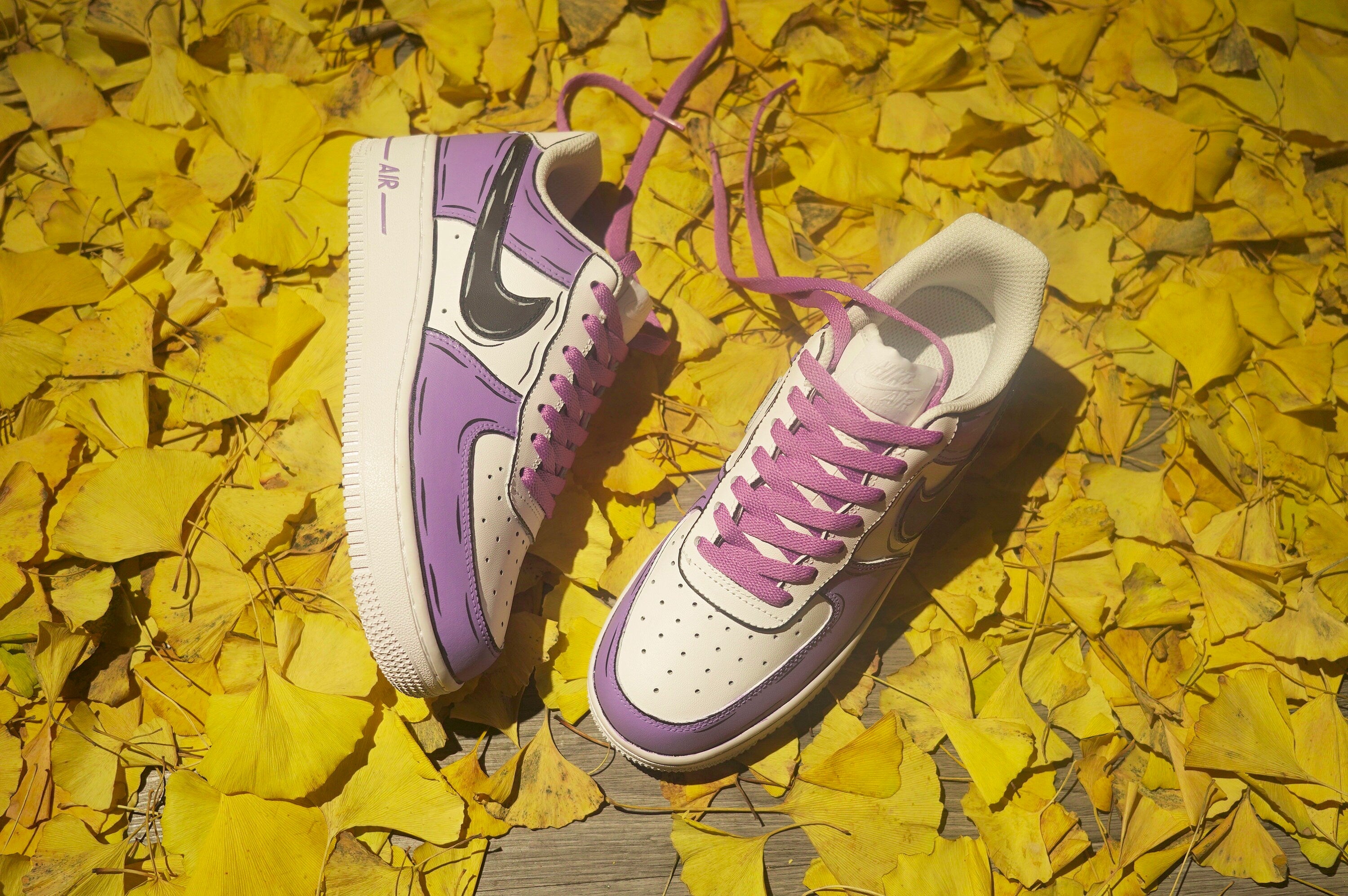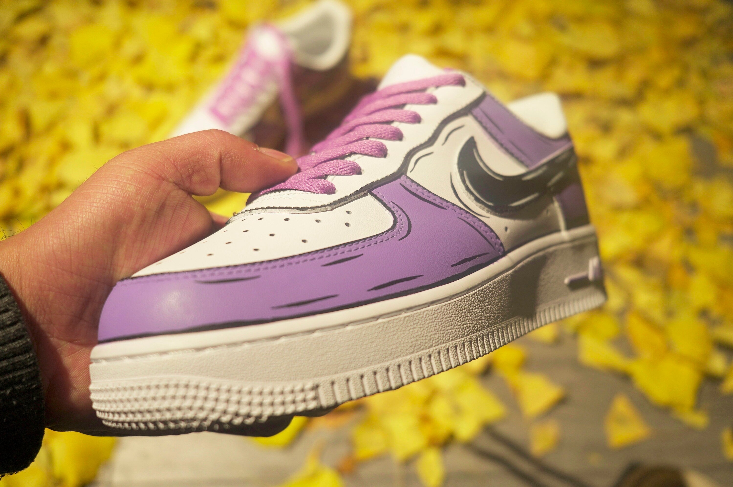 Stand out from the crowd with our Purple and Black Custom Air Force 1 shoes. Designed for risk-takers, these bold kicks will take you on a wild ride of style and adventure. Don't be afraid to make a statement with our unique design and fearless attitude. Step into a world of excitement with these custom shoes.