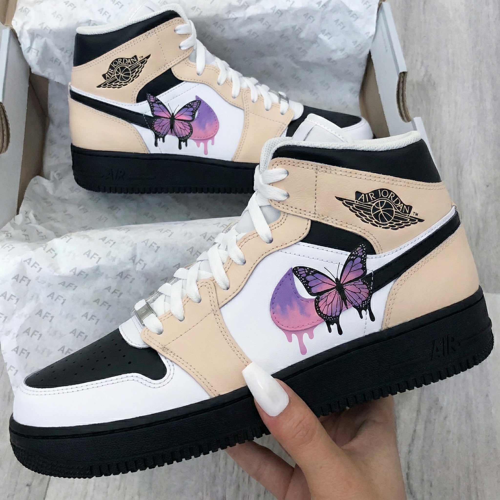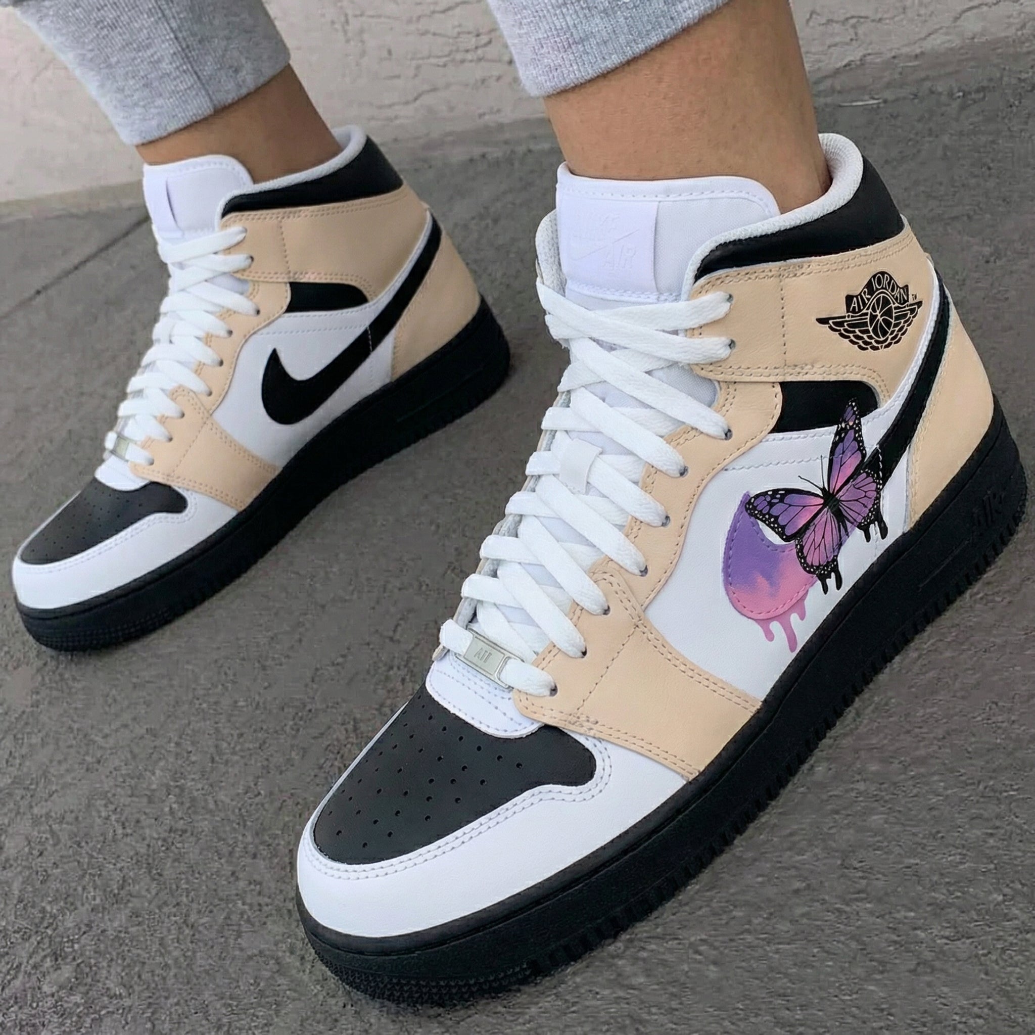 Elevate your sneaker game with these one - of - a - kind Custom AJ1s. The Butterfly Beige Black colorway is a sight to behold, blending beige, black, and white in a stylish manner. The eye - catching purple butterfly graphic adds a touch of whimsy and individuality to these custom sneakers. Not only do these Custom AJ1s look great, but they also offer comfort and support. The high - quality materials ensure durability, making them perfect for everyday wear. Whether you're hitting the streets or just hanging out, these custom sneakers will make you stand out from the crowd.