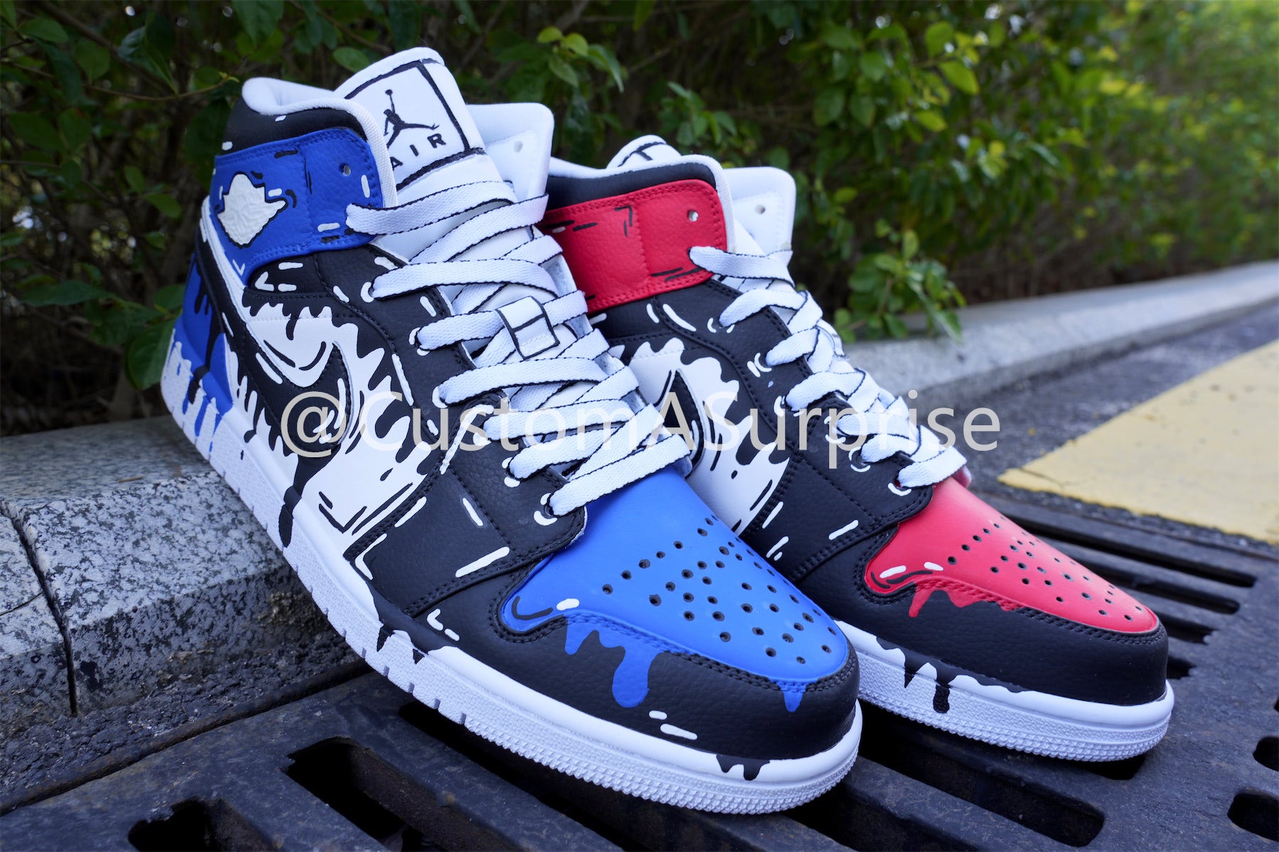 Step up your sneaker game with our Dripping Black Blue Red Custom Air Jordan 1! With a unique and playful design, these kicks will have you looking fly and standing out from the crowd. Perfect for any sneakerhead looking to make a statement.