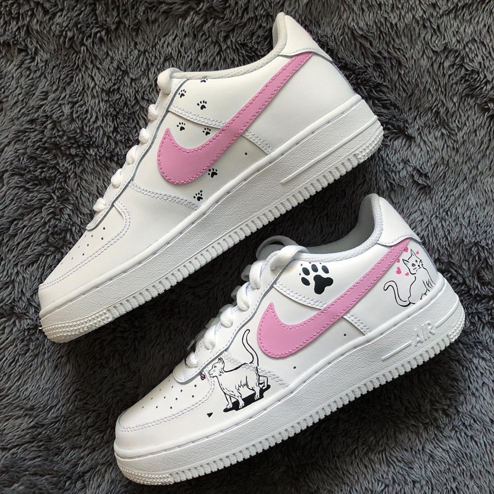 Step up your sneaker game with these purrfect Cat And Paw Print Doodles. Custom-designed on classic Air Force 1s, these shoes are the cat's meow.