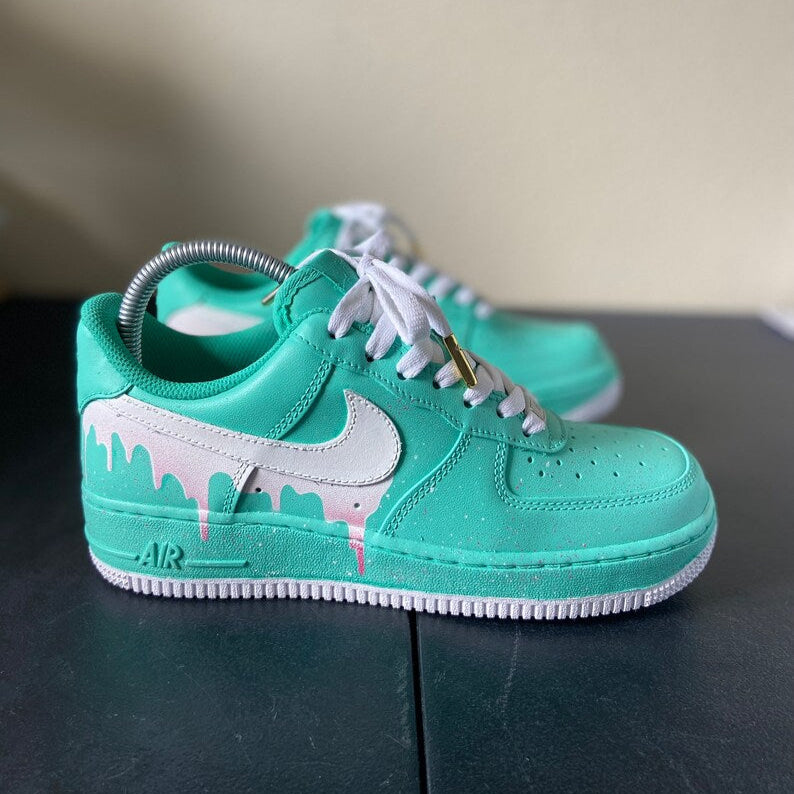 Get ready to drip in style with our Mint Green Drip Swoosh Custom Air Force 1s. These kicks feature a unique mint green design that will make you stand out from the crowd. Bring some fun and playfulness into your wardrobe with these one-of-a-kind shoes.