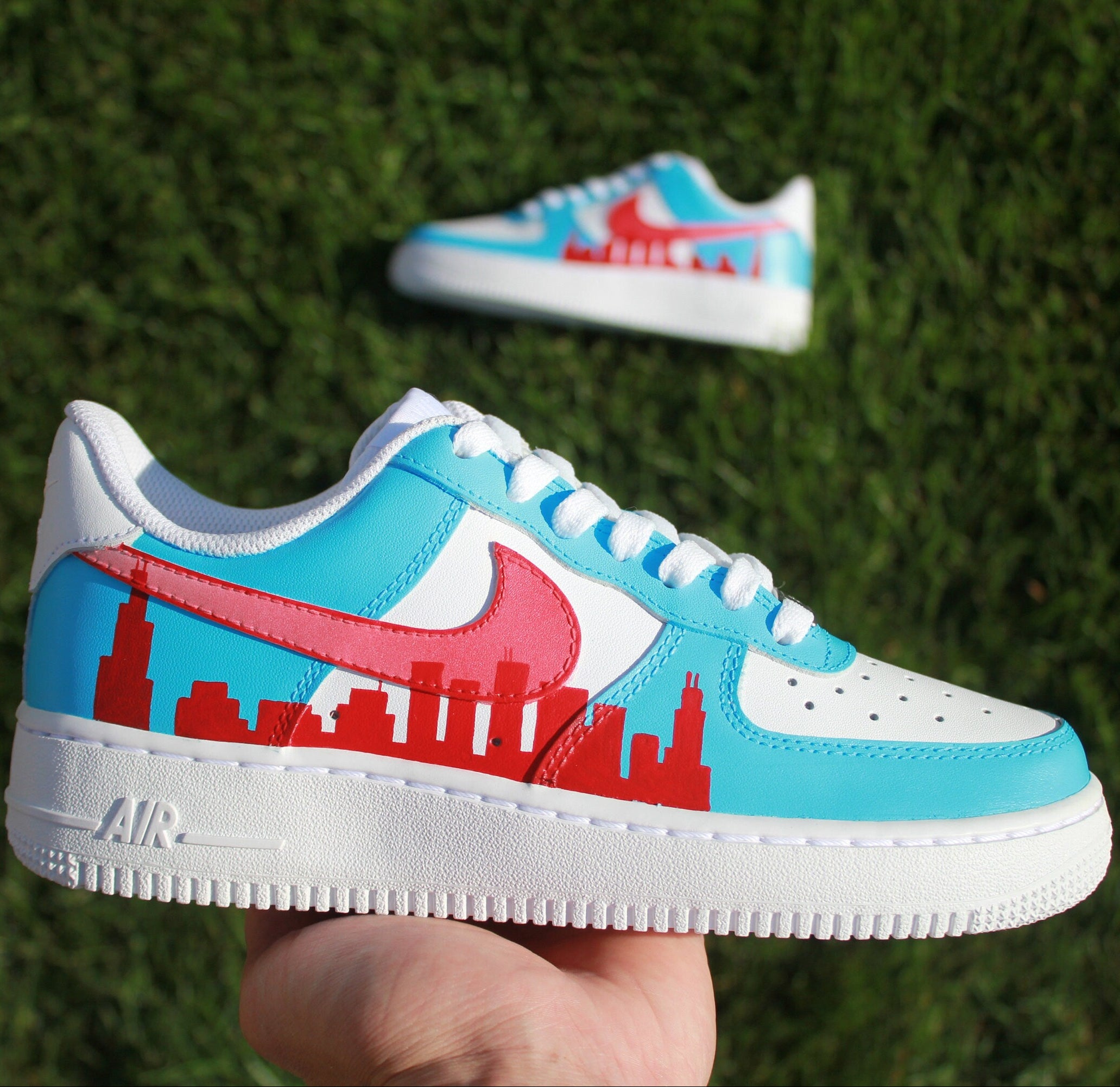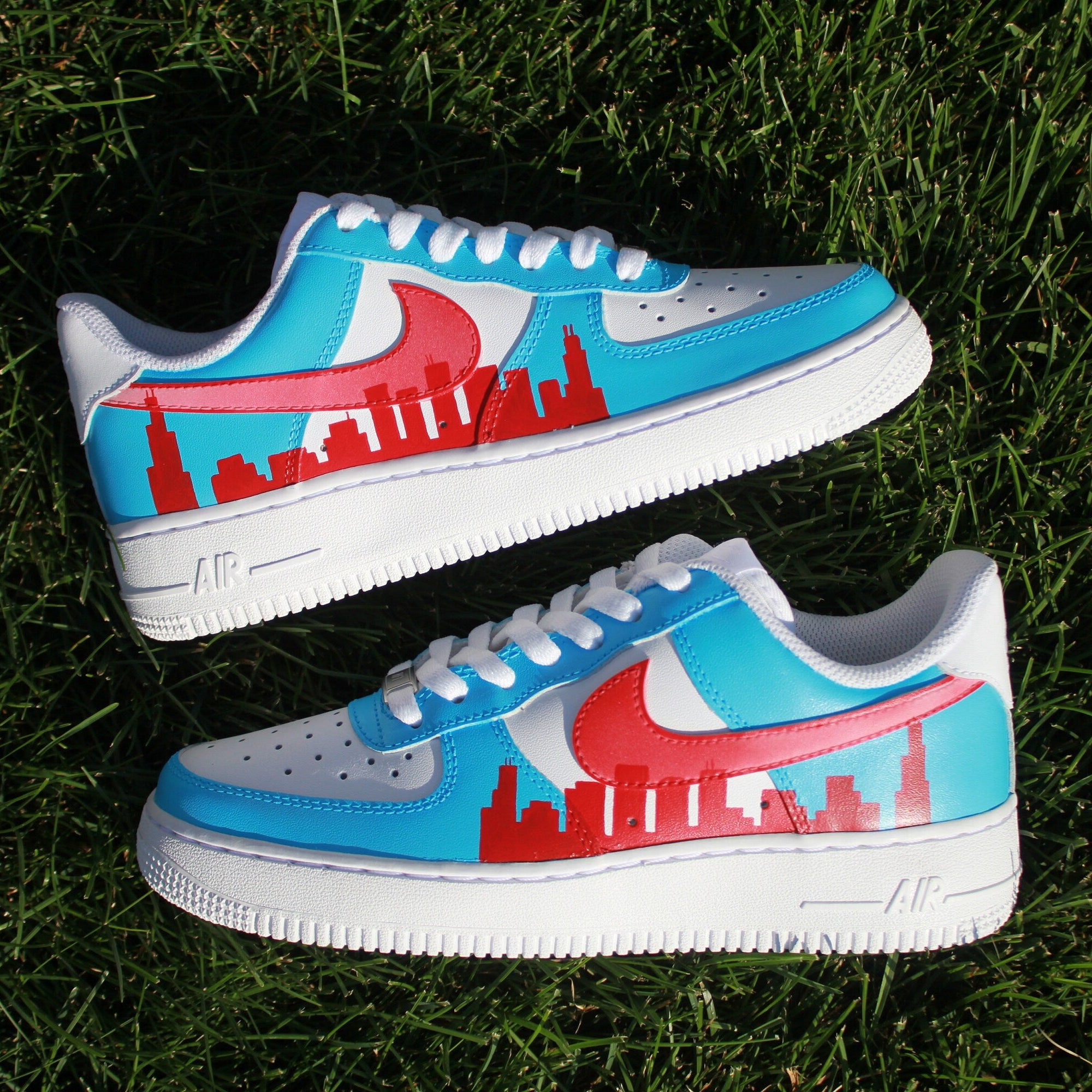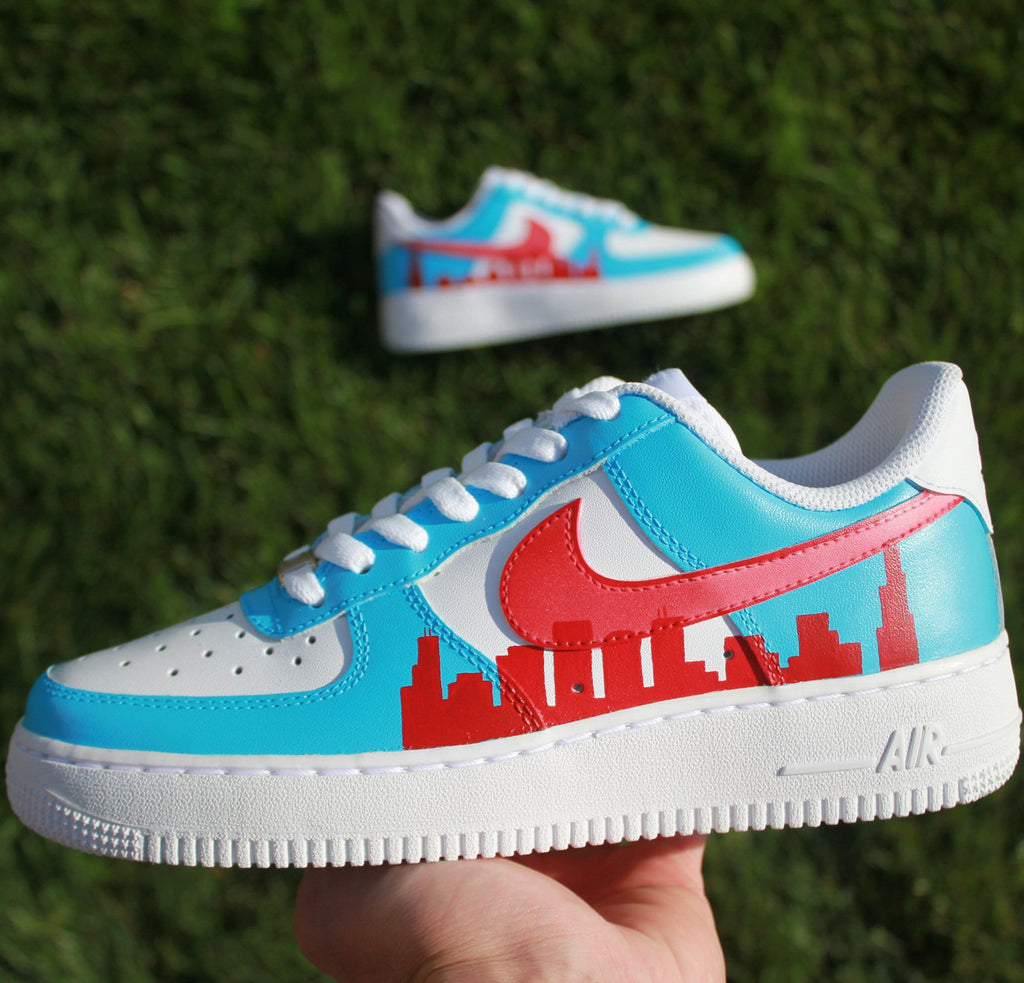 Step up your sneaker game with these Red City Silhouette Custom Air Force 1s. Featuring a vibrant red color and a unique city silhouette design, these kicks are sure to turn heads. Perfect for adding a bold and playful touch to any outfit. Elevate your style with these one-of-a-kind shoes!