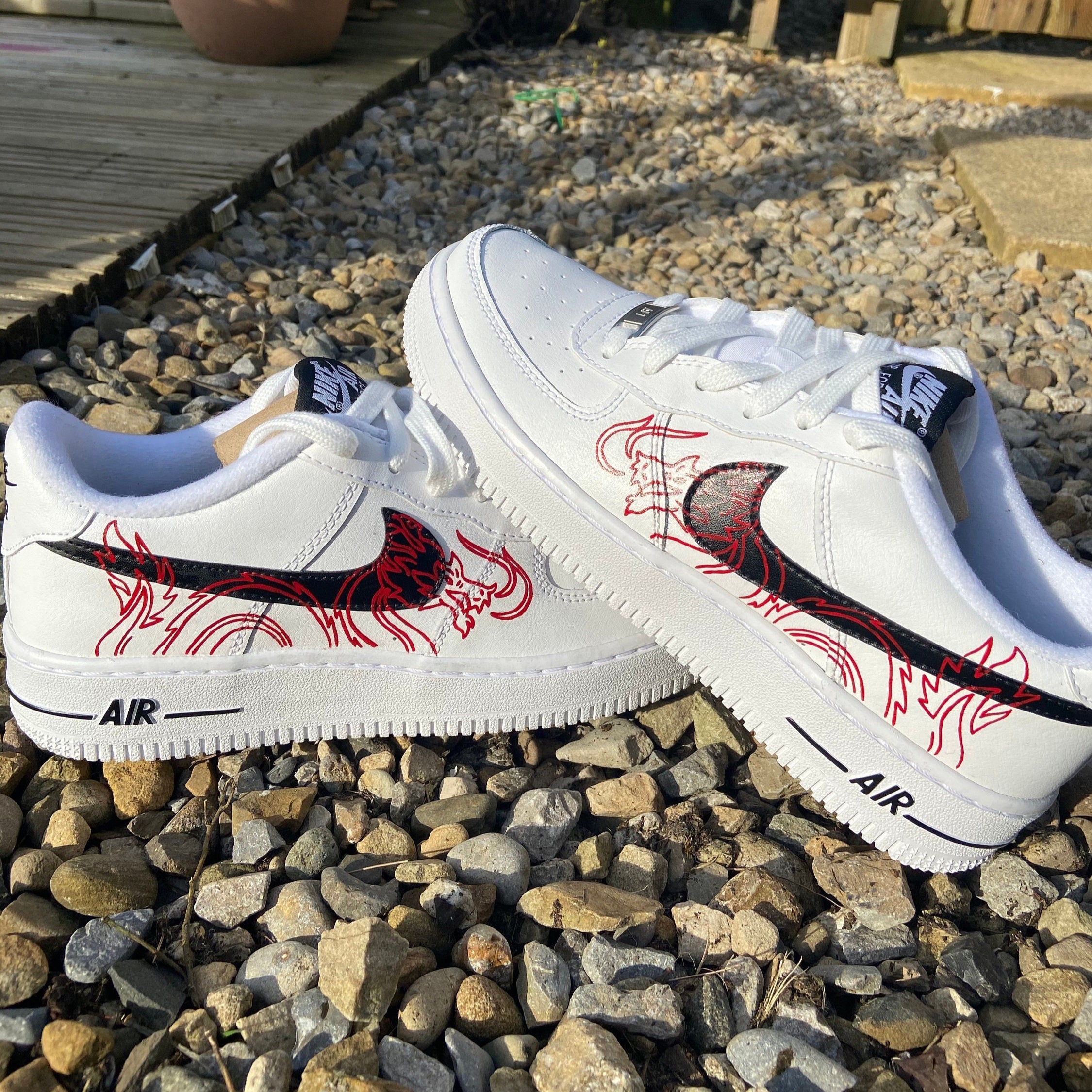 Unleash your inner dragon with these one-of-a-kind Red Dragon Doodle Custom Air Force 1s. Made with expert craftsmanship, they feature a fiery red dragon design that is sure to turn heads (or breathe fire?). Perfect for those who want to stand out and unleash their unique style.
